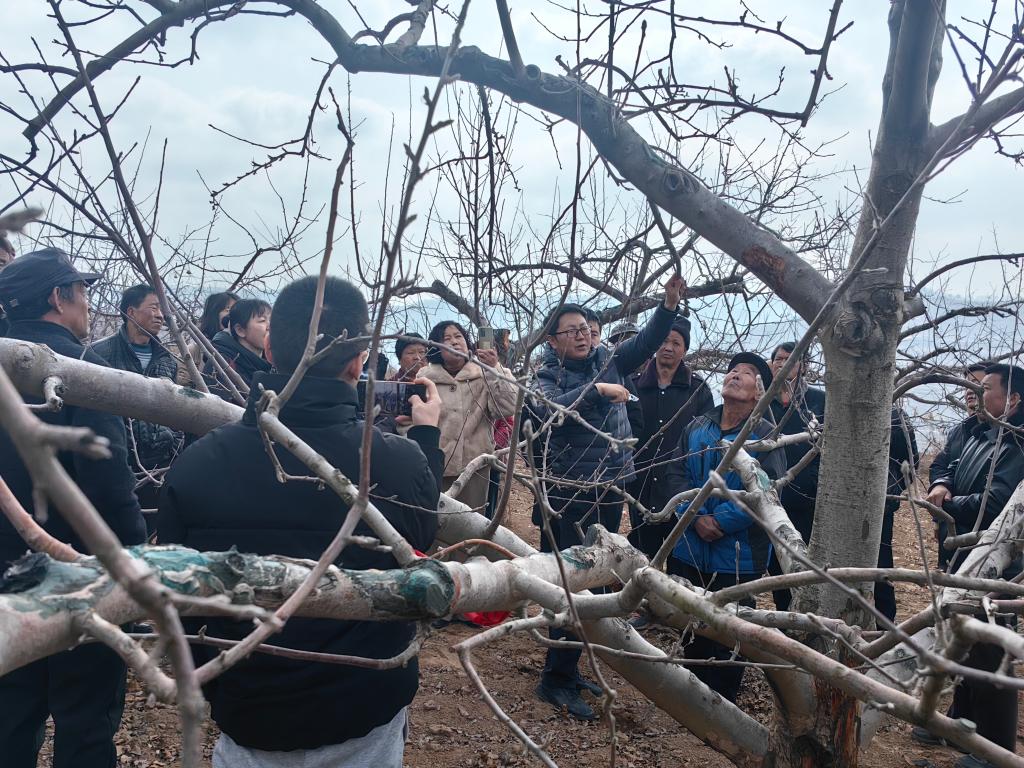 在实践教学中,中心主任郭志刚现场示范春季修剪技术,手把手指导果农调整树形结构,果农们有的用手机录像,有的现场比划模仿,纷纷表示这种讲解+实操的培训很实用,解决了很多实际问题。